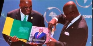 وقدم الدكتور إلومبي كتاب مصور الى البروفيسور أوراما يوثق فيه بالصور مشوار 10 سنوات  للرئيس المنتهي ولايته أوراما ، كانت بمثابة تاريخ لنهضة مصرفية وتنموية وإقتصادية فى أفريقيا .