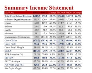 كما ساهمت شركات «eCards» لتكنولوجيا تشغيل البطاقات الذكية و«eAswaaq» لتكنولوجيا تشغيل الأسواق الإلكترونية و«إي نابل» لخدمات التعهيد في دفع نتائج المجموعة خلال الفترة أيضًا. وخلال الربع الثالث من عام 2023، ارتفعت الإيرادات بنسبة سنوية 52.3٪ لتسجل 1.03 مليار جنيه تقريبًا.