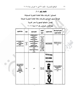 نشرت الجريدة الرسمية قرار وزارة التجارة والصناعة الخاص بموافقة الهيئة العامة للرقابة على الصادرات والواردات، بشأن قيد بعض المصانع والشركات مالكة العلامات التجارية المستوفاة لقواعد تسجيل المصانع المؤهلة لتصدير منتجاتها إلى مصر.