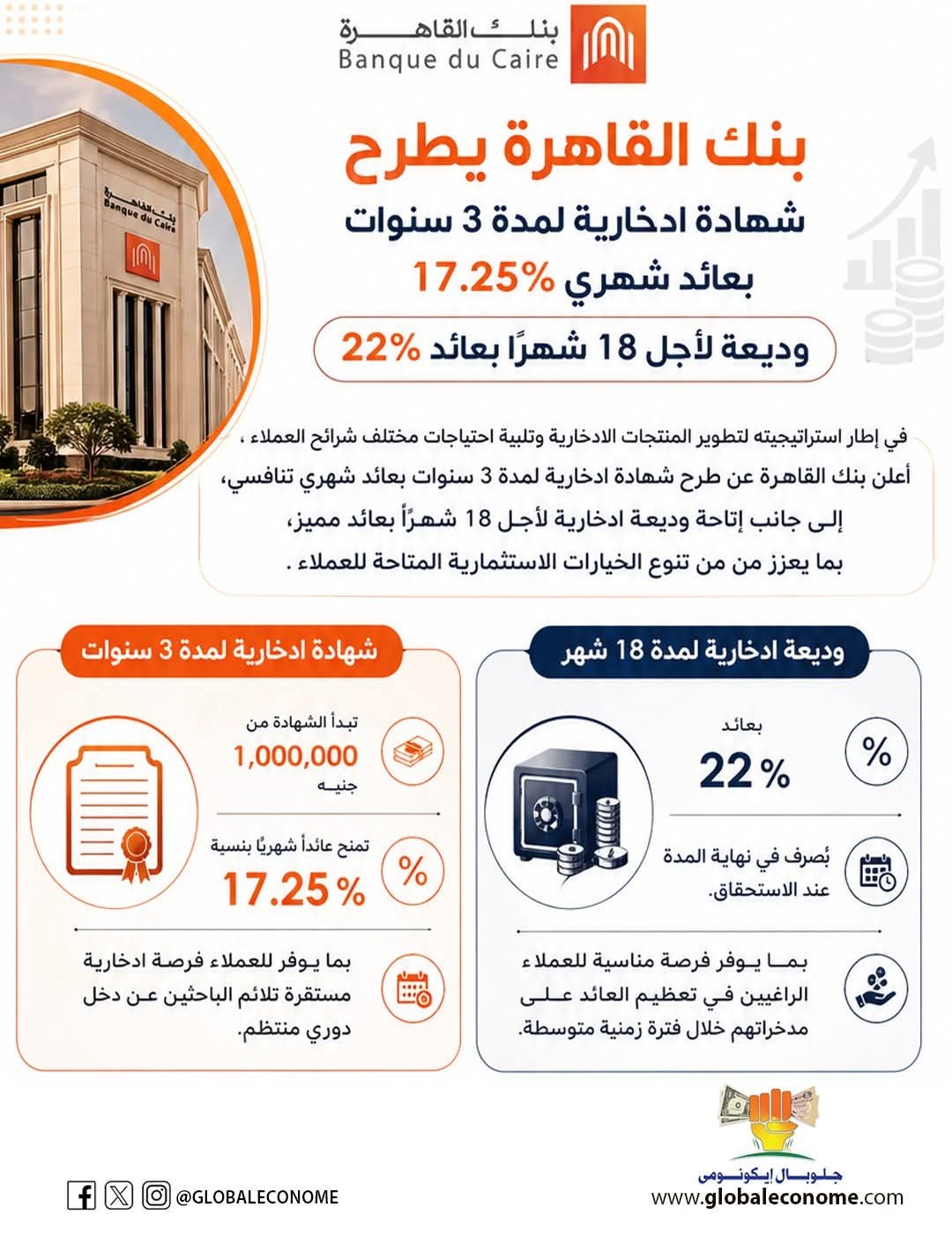 وينشر موقع جلوبال ابكونومي بوابة الاقتصاد العربية، بالانفوجراف، تفاصيل الشهادة الادخارية الجديدة والوديعة الجديدة من بنك القاهرة بالجنيه المصري.