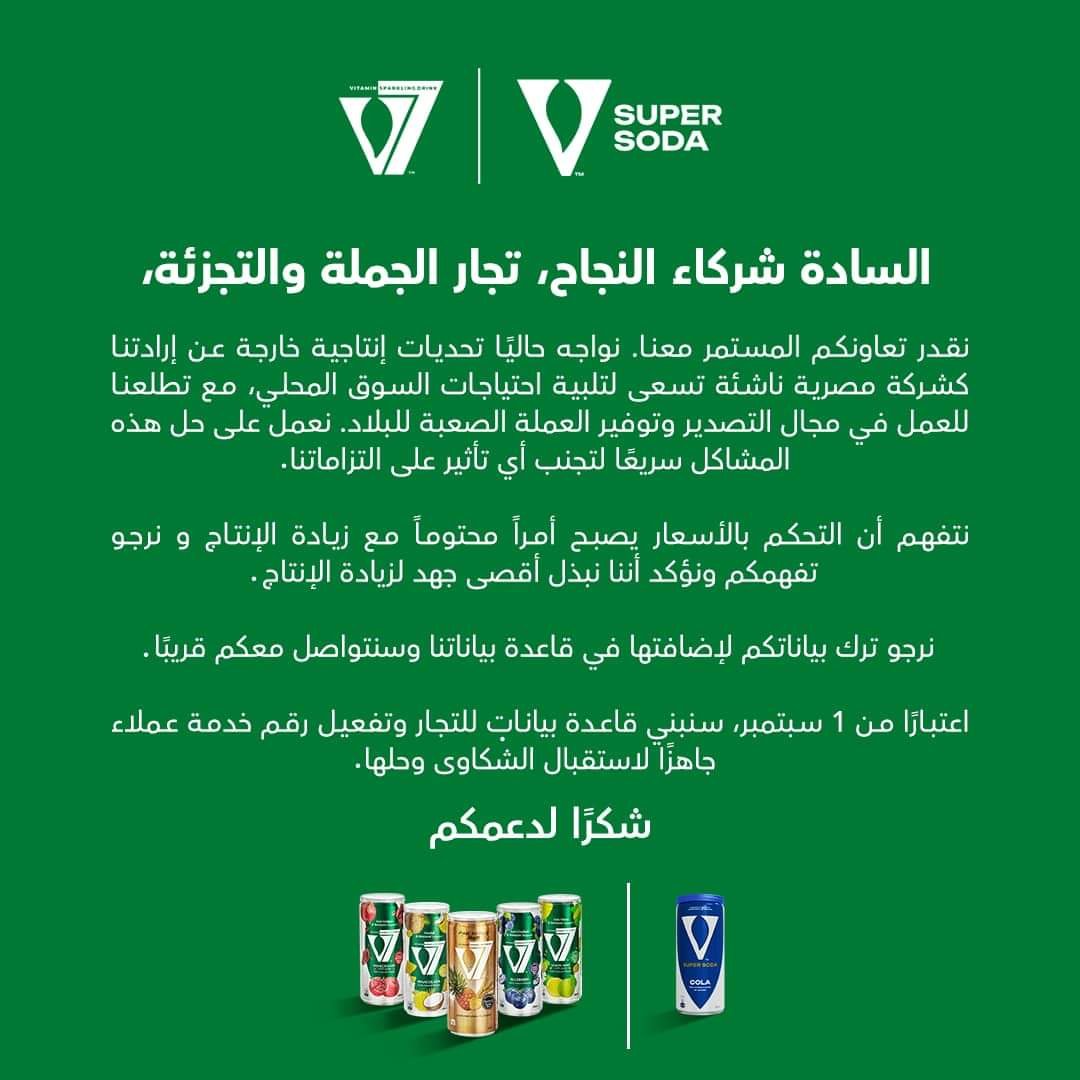 نشرت شركة V7 للمشروبات الغازية المصرية، بياناً لها منذ دقائق بشأن التواصل الجيد مع التجار، وبيع منتجات الشركة بأسعار مقبولة عن طريق زيادة الإنتاج.