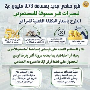 – المساحات المطروحة للأراضي تتراوح بين 118 متر مربع و400 ألف متر مربع في بعض المناطق الصناعية بما يلبّي احتياجات مختلف فئات المستثمرين،