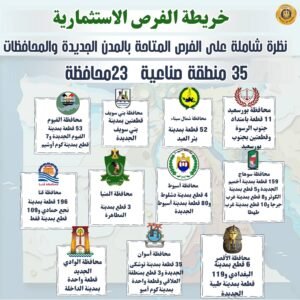 – جاء توزيع الأراضي المطروحة كالتالي 5 قطع بمدينة أكتوبر الجديدة بمحافظة الجيزة، و36 قطعة بمدينة بدر بمحافظة القاهرة، و40 قطعة بمدينة برج العرب الجديدة بمحافظة الإسكندرية، وقطعتين بمدينة العاشر من رمضان وقطعة واحدة بمدينة الصالحية الجديدة بمحافظة الشرقية، و6 قطع بمدينة السويس الجديدة بمحافظة السويس، و22 قطعة بمدينة السادات بمحافظة المنوفية، و71 قطعة بمدينة حوش عيسى و33 قطعة بمدينة وادي النطرون بمحافظة البحيرة، و56 قطعة بمدينة العلمين الجديدة بمحافظة مرسى مطروح، و6 قطع بمدينة جمصة بمحافظة الدقهلية، و104 قطع بمدينة القنطرة شرق بمحافظة الإسماعيلية، و4 قطع بمدينة المحلة الكبرى بمحافظة الغربية، و20 قطعة بمدينة مطوبس بمحافظة كفر الشيخ، و11 قطعة بامتداد جنوب الرسوة وقطعتين بجنوب بورسعيد بمحافظة بورسعيد، و52 قطعة بمدينة بئر العبد بمحافظة شمال سيناء، وقطعتين بمدينة بني سويف الجديدة بمحافظة بني سويف، و53 قطعة بمدينة الفيوم الجديدة و7 قطع بمدينة كوم أوشيم بمحافظة الفيوم، و3 قطع بمدينة المطاهرة بمحافظة المنيا، و4 قطع بمدينة دشلوط و80 قطعة بمدينة أسيوط الجديدة بمحافظة أسيوط، و159 قطعة بمدينة أخميم الجديدة و5 قطع بمدينة الكوثر و8 قطع بمدينة غرب جرجا و10 قطع بمدينة غرب طهطا بمحافظة سوهاج، و196 قطعة بمدينة نجع حمادي و109 قطع بمدينة قفط بمحافظة قنا، و6 قطع بمدينة البغدادي و119 قطعة بمدينة طيبة الجديدة بمحافظة الأقصر، و35 قطعة بمدينة توشكى الجديدة و3 قطع بمنطقة العلاقي وقطعة واحدة بمدينة كوم أمبو بمحافظة أسوان، وقطعة واحدة بمدينة الداخلة بمحافظة الوادي الجديد.