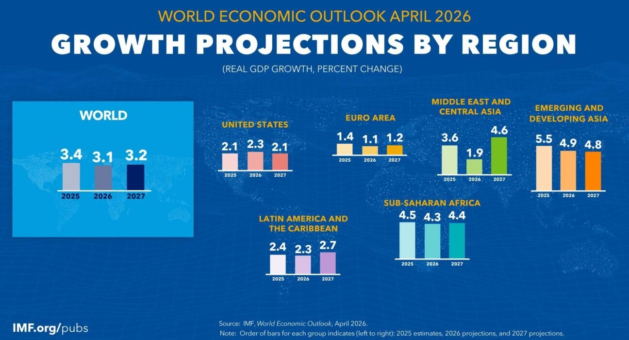 قال تقرير الاقتصاد العالمي الصادر عن صندوق النقد الدولي ، بعد أن صمدت الأنشطة الاقتصادية العالمية أمام ارتفاع الحواجز التجارية وتزايد حالة عدم اليقين العام الماضي، تواجه الآن اختباراً حقيقياً جراء اندلاع الحرب في الشرق الأوسط. وبافتراض أن الصراع سيظل محدوداً من حيث المدة والنطاق، فمن المتوقع أن يتباطأ النمو العالمي إلى 3.1% في عام 2026 و3.2% في عام 2027. كما يُتوقع أن يرتفع معدل التضخم العالمي الرئيسي ارتفاعاً طفيفاً في عام 2026 قبل أن يستأنف انخفاضه في عام 2027. ومن المتوقع أن يكون تباطؤ النمو وارتفاع التضخم أكثر وضوحاً في الأسواق الناشئة والاقتصادات النامية.