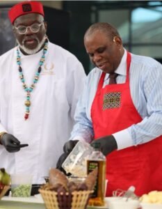 على هامش فعاليات معرض التجارة البينية الأفريقي IATF2023 ، تم إقامة جلسة طهي للاحتفال بالطهي الأفريقي ، خلع فيها البروفيسور بنديكت أوراما، رئيس Afreximbank المنظمه للمعرض ، الملابس الرسمية ، وتخلى عن كل أنواع البروتوكولات للمسؤلين ، و ارتدى ملابس المطبخ ، وقرر مزاولة عشقه القديم فى صنع أكلات يعشقها من المطبخ الافريقى ، وهذا الفن الجميل الذى يعشقه الرجال والنساء معا ، لأنه يعني وجود أفكارًا مقنعة حول الدور العميق للطعام في حياتنا.