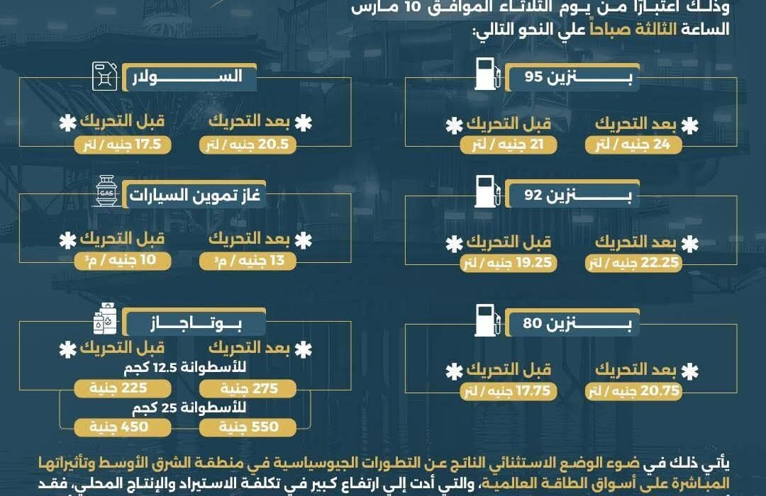 فأعلنت وزارة البترول أنه تقرر تعديل أسعار بعض المنتجات البترولية وغاز تموين السيارات في ظل الظروف الاستثنائية التي تمر بها اسواق الطاقة عالمياً ، وذلك اعتبارًا من يوم الثلاثاء الموافق 10 مارس الساعة الثالثة صباحاً علي النحو التالي: