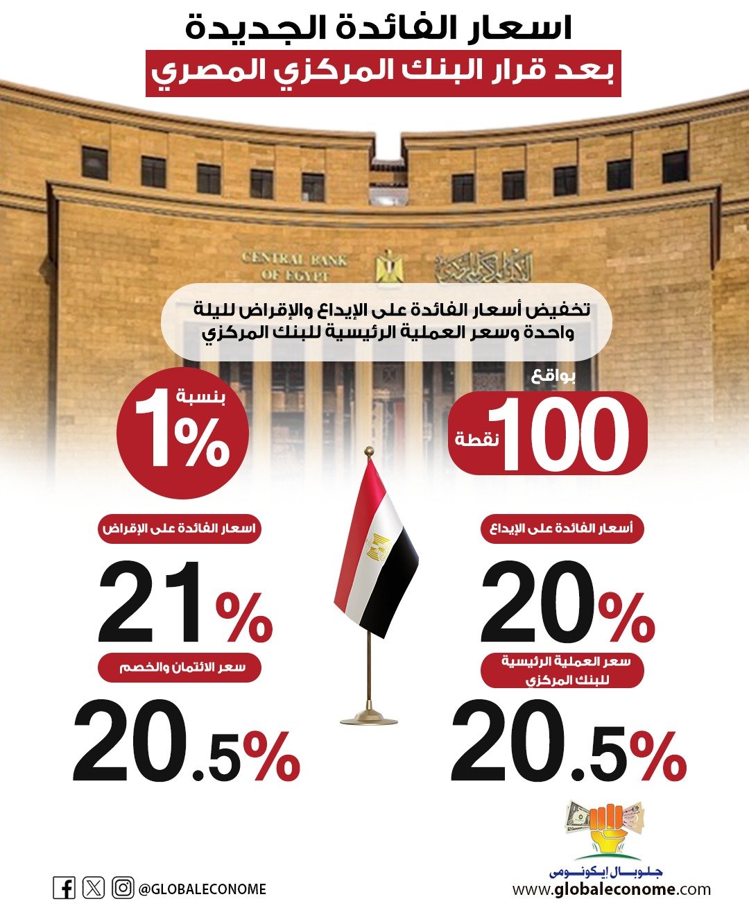 وتنشر جلوبال ايكونومي، أسعار الفائدة الجديدة بعد قرار البنك المركزي المصري، بالانفوجراف ..