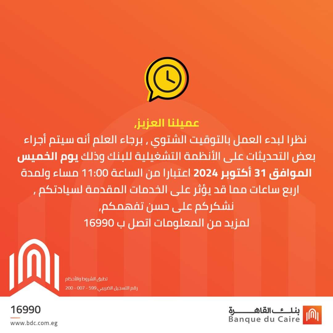 قال بنك القاهرة، إنه نظرا لبدء العمل بالتوقيت الشتوي، يرجى العلم أنه سيتم إجراء بعض التحديثات على الأنظمة التشغيلية للبنك.