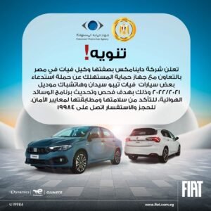 قرر جهاز حماية المستهلك ، بالتعاون مع شركة داينامكس وكيل شركة فيات بمصر، تنفيذ حملة إستدعاء لفحص الايرباج ( الوسائد الهوائية ) من بعض سيارات فيات تيبو السيدان والهاتشباك موديلات 2021، و 2022 .