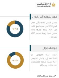 أظهرت مؤشرات السلامة المالية صلابة وقوة القطاع المصرفي كأحد الركائز التي تعتمد عليها الدولة لتحقيق الاستقرار الاقتصادي المالي والنقدي من خلال قدرته على توفير التمويل لقطاعات النشاط الاقتصادي المختلفة بما ينعكس على زيادة الناتج القومي وتحقيق معدلات نمو واستثمار عالية وخلق فرص متاحة للعمل لكافة المواطنين، حيث تحسن معدل كفاية رأس المال ليبلغ 19.1%، وذلك في نهاية الربع الثالث من عام 2024 بزيادة قدرها 0.5% مقابل نسبة رقابية قدرها 12.5% كحد أدنى.
