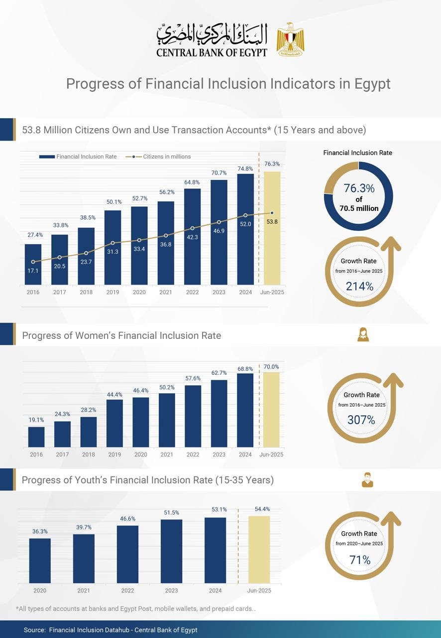 وسجلت مؤشرات الشمول المالي للشباب تزايدًا مستمرًا، حيث ارتفعت إلى 54.4% في يونيو 2025 مقابل 53.1% في ديسمبر 2024، مدعومة بالإجراءات التي اتخذها البنك المركزي لتعزيز تمكين الشباب ماليًا، ومنها السماح بفتح حسابات مصرفية بدءًا من سن 15 عامًا.