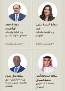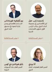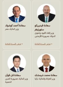 ويشارك من مصر ، حسن عبدالله محافظ البنك المركزي المصري ، ورانيا المشاط وزيرة التخطيط والتعاون الدولي والتنمية الإقتصادية ، وأحمد كجوك وزير المالية .