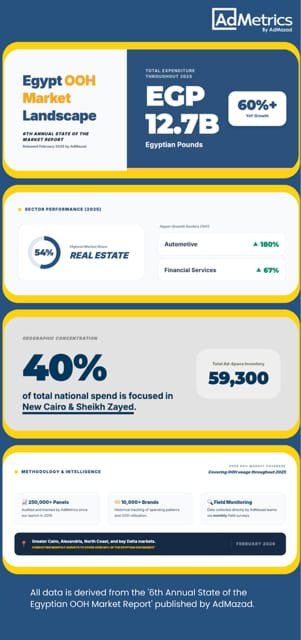قفز إجمالي الإنفاق على الإعلانات الخارجية في مصر بنسبة 60% خلال عام 2025 ليصل إلى 12.7 مليار جنيه وفقا للتقرير السنوي السادس لشركة AdMazad حول حالة سوق الإعلانات الخارجية وكشفت نتائج أداة AdMetrics  المنصة الرائدة في قياس وتحليل أداء الإعلانات الخارجية في مصر عن تحول ملموس في صدارة السوق من الهيمنة العقارية نحو ما يعرف بـ اقتصاد العلامات التجارية مدفوعا بشراكة استراتيجية بين كبار المصنعين وقطاع الخدمات المالية.