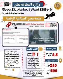 جددت وزارة الصناعة دعوتها لكافة المستثمرين الصناعيين الجادين لسرعة التقدم للاستفادة من الطرح الحادي عشر للأراضي الصناعية وذلك من خلال منصة مصر الصناعية الرقمية (madein.eg) حيث يتبقى يومين فقط على موعد غلق باب التقديم والمقرر له يوم الخميس الموافق 11 سبتمبر 2025، ويشمل الطرح 1386 قطعة أرض صناعية كاملة المرافق، موزعة على 23 محافظة داخل 35 مدينة ومنطقة صناعية، بمساحة إجمالية تقدر بـ6.8 مليون متر مربع، بما يتيح فرصاً استثمارية متميزة للراغبين في إقامة مشروعات صناعية جديدة أو التوسع في استثماراتهم القائمة.