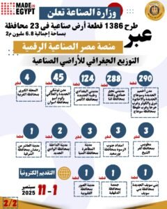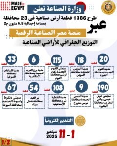 وحول التوزيع الجغرافي للأراضي الصناعية فسيتم طرح ٢٠ قطعة بمدينة أكتوبر الجديدة بمحافظة الجيزة، و١٨ قطعة بمدينة السويس الجديدة بمحافظة السويس، و١١٥ قطعة بمدينتي الفيوم الجديدة وكوم اوشيم بمحافظة الفيوم، و٦ قطع بمدينة برج العرب الجديدة بمحافظة الإسكندرية، و٣٣ قطعة بمدينة السادات بمحافظة المنوفية، و١٩٠ قطعة بمدينتي حوش عيسي ووادى النطرون بمحافظة البحيرة، و٩ قطع بمدينة العلمين الجديدة بمحافظة مرسي مطروح، و١٠٨ قطعة بمدينة القنطرة شرق بمحافظة الإسماعيلية، و٥٤ قطعة ببئر العبد بمحافظة شمال سيناء و٦٧ قطعة بمدينتي دشلوط واسيوط الجديدة بمحافظة أسيوط و٢٩٠ قطعة ارض بمدن اخميم الجديدة وسوهاج الجديدة والاحايوة شرق والكوثر وغرب جرجا وغرب طهطا بمحافظة سوهاج، و٢٨٨ قطعة بمدينتي نجع حمادي وقفط بمحافظة قنا و١٢٤ قطعة بمدينتي البغدادي وطيبة الجديدة بمحافظة الأقصر، و٤٥ قطعة بمدن توشكي الجديدة والعلاقي وكوم امبو بمحافظة اسوان، و٤ قطع بالمحلة الكبرى بمحافظة الغربية، و٣ قطع بمطوبس بمحافظة كفر الشيخ، و٣ قطع بامتداد جنوب الرسوة بمحافظة بورسعيد، و٣ قطع بمدينة المطاهرة بمحافظة المنيا، وقطعتين بمدينة الداخلة بمحافظة الوادي الجديد، وقطعة بمدينة العاشر من رمضان بمحافظة الشرقية، وقطعة ببني سويف الجديدة بمحافظة بني سويف، وقطعة بجمصة بمحافظة الدقهلية وقطعة بمدينة العبور بمحافظة القليوبية.