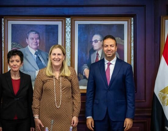 رحب رامي أبو النجا، نائب محافظ البنك المركزي المصري، هيلين بودليجر أرتيدا، وزيرة الدولة السويسرية للشؤون الاقتصادية، والدكتورة إيفون باومان، سفيرة سويسرا لدى