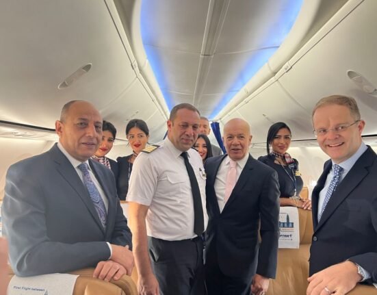 شهد اليوم السبت الفريق محمد عباس حلمى وزير الطيران المدنى و غاريث بايلي السفير البريطانى بالقاهرة ، مراسم إنطلاق أولى رحلات شركة مصر