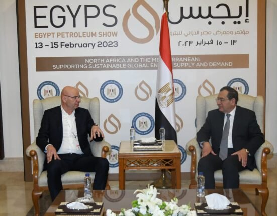 نرمين حسين التقي المهندس طارق الملا وزير البترول والثروة المعدنية وفدا من شركة MAVEG الألمانية علي هامش ختام مؤتمر ومعرض مصر الدولى للبترول