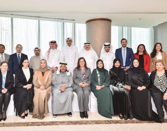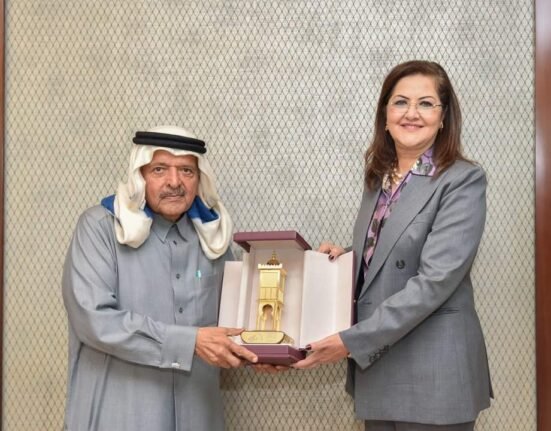 كرمت رابطة رجال الأعمال القطريين الدكتورة هالة السعيد وزيرة التخطيط والتنمية الاقتصادية وسلم الشيخ فيصل بن قاسم آل ثاني، رئيس رابطة رجال الأعمال