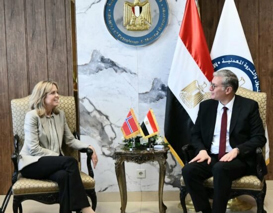 بحث المهندس كريم بدوى وزير البترول والثروة المعدنية، مع هيلدا كليمستدال سفيرة النرويج بالقاهرة ومحمد عامر نائب الرئيس التنفيذى بشركة سكاتك النرويجية لمنطقة